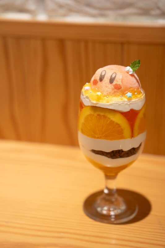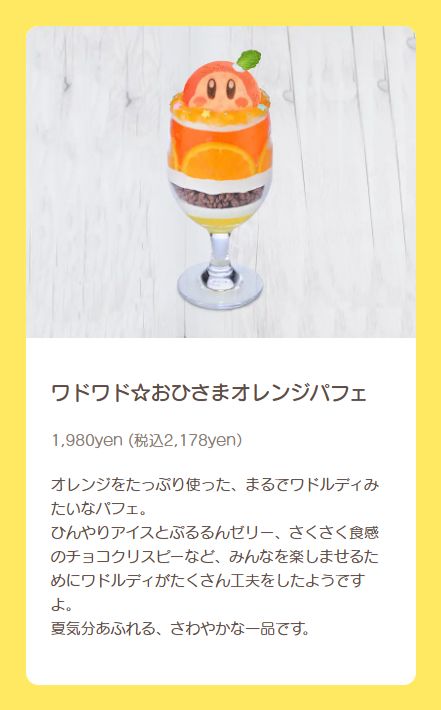 看板キャラクターでもあるワドルディが登場する、さわやかなオレンジ色が印象的なデザートメニューです。