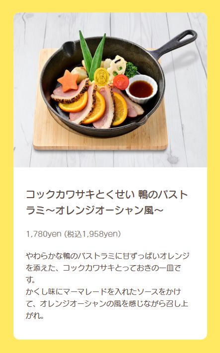 今回はコックカワサキとくせい 鴨のパストラミ~オレンジオーシャン風~をご紹介します。価格は税込み1,958円。