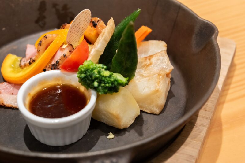 周囲にはれんこん、ジャガイモ、オクラも添えられています。