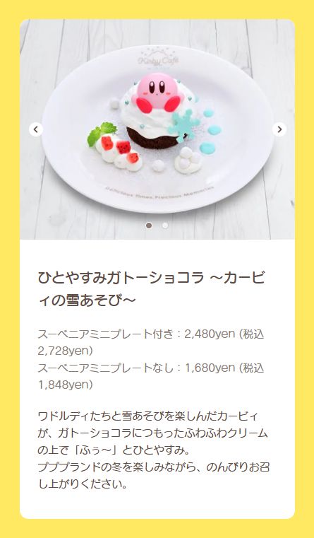 今回はひとやすみガトーショコラ ~カービィの雪あそび~をご紹介します。価格はスーベニアミニプレート付きで税込み2,728円、スーベニアミニプレートなしで税込み1,848円。