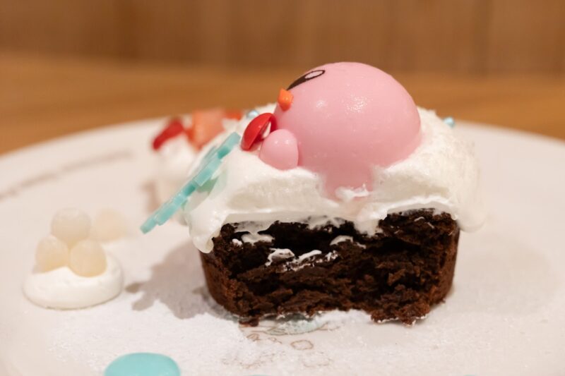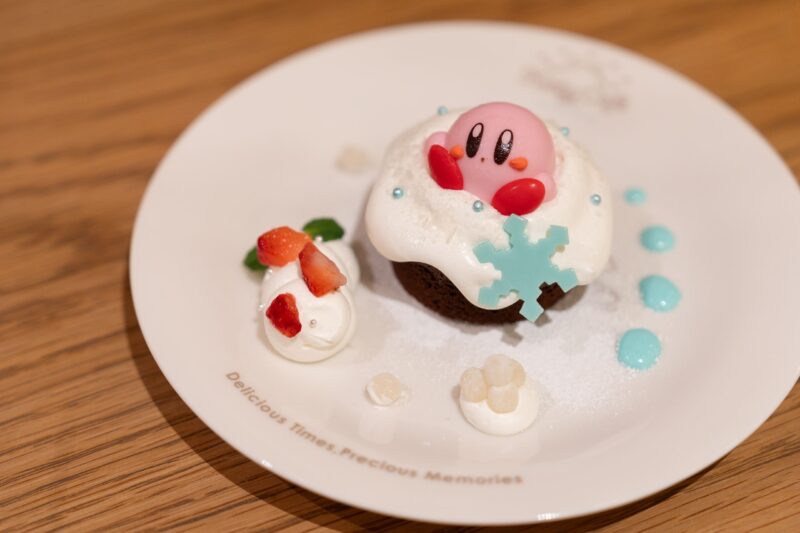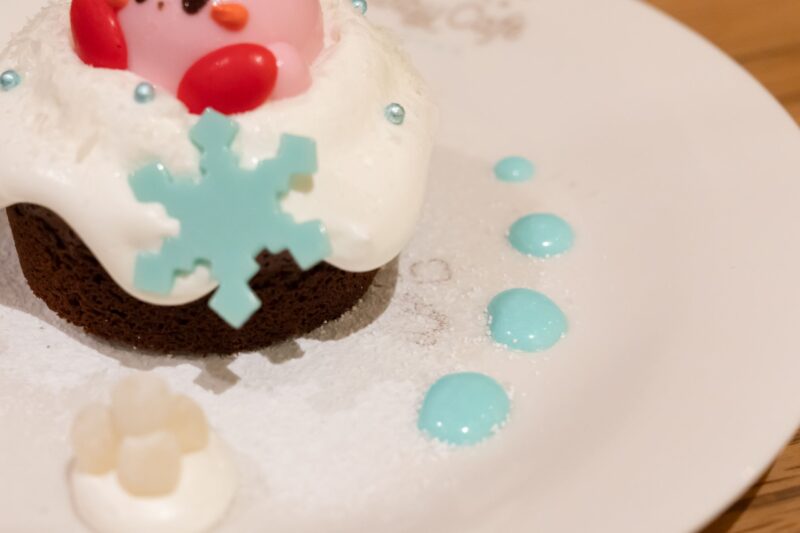 カービィカフェ WINTER 2025の限定メニューから「ひとやすみガトーショコラ ~カービィの雪あそび~」をご紹介します。