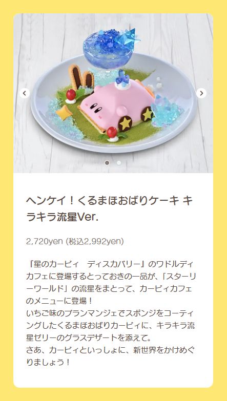カービィカフェ 期間限定メニュー「ヘンケイ!くるまほおばりケーキ キラキラ流星Ver.」をご紹介