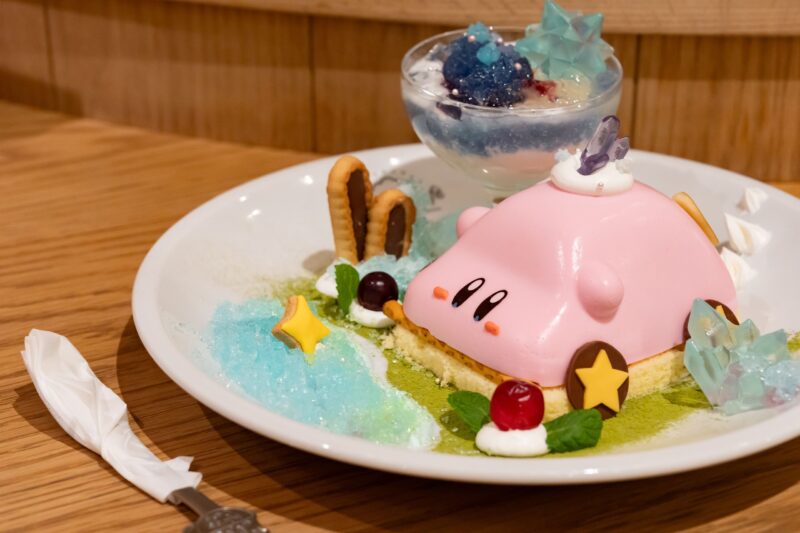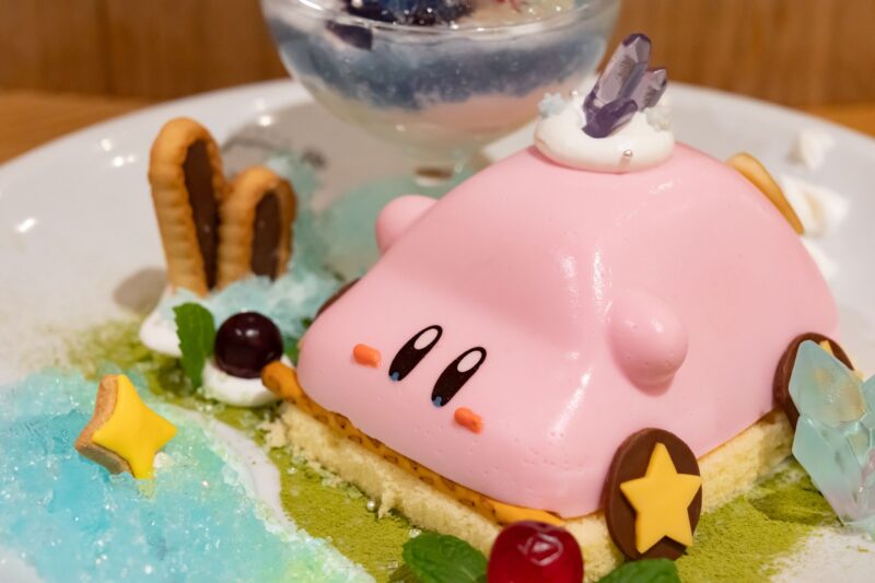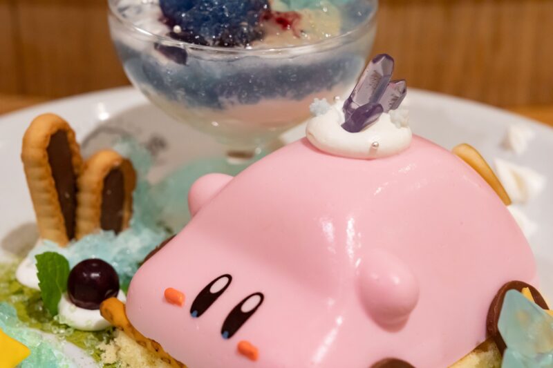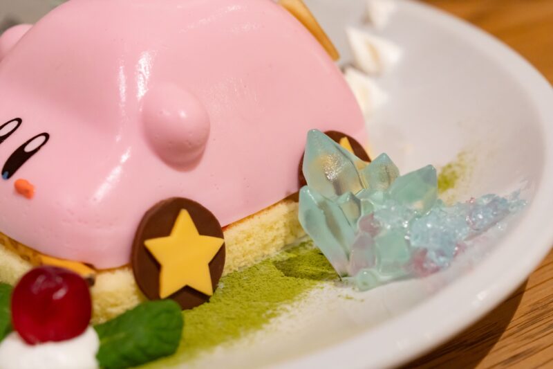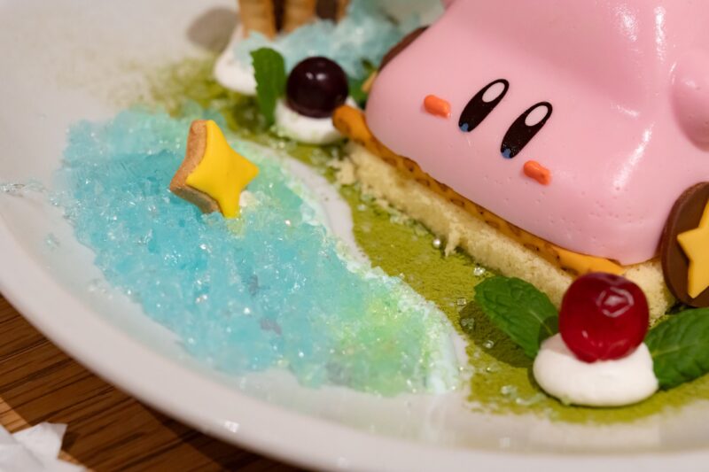 ブランマンジェでできたカービィ。配膳されるタイミングでもプルプル動いていて、テーブルに到着してからも、つい揺らして確認したくなります。