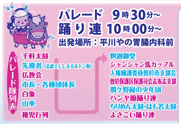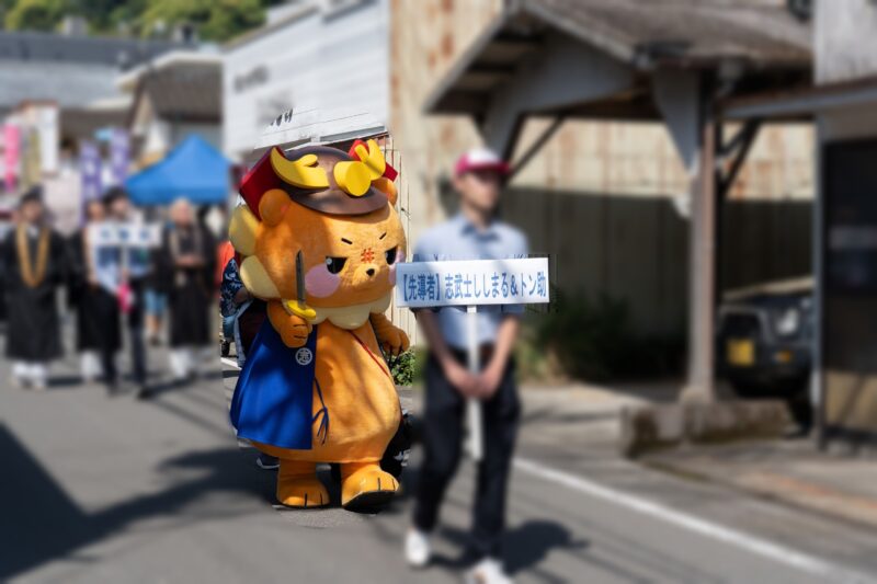例として、(私が訪問した)2025年4月のパンフレットには、パレード隊列表の中に、「先導者(志武士ししまる&トン助)」の記載を確認できます。