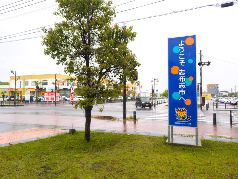 志布志駅前の「ようこそ 志布志市へ」の看板にも志武士ししまる。